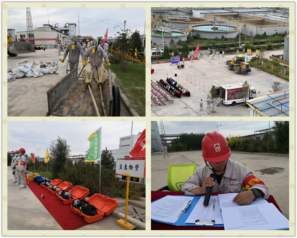 “報告總指揮,各演練部門準備完畢,氯乙烯球罐單體泄漏應(yīng)急演練是否開始!薄伴_始!”隨著演練總指揮、片區(qū)副總經(jīng)理、廣拓能源總經(jīng)理賈存富的一聲令下,應(yīng)急演練正式開始!北敬窝菥氃O(shè)定為一般突發(fā)事件應(yīng)急響應(yīng),演練內(nèi)容是:廣拓能源有限公司廢酸處理稀硫酸罐排污閥泄露,由于稀硫酸泄漏量較大,啟動突發(fā)應(yīng)急預(yù)案。主要演練現(xiàn)場警戒、人員撤離、筑壩攔截預(yù)防稀硫酸外溢、危險廢物收集。